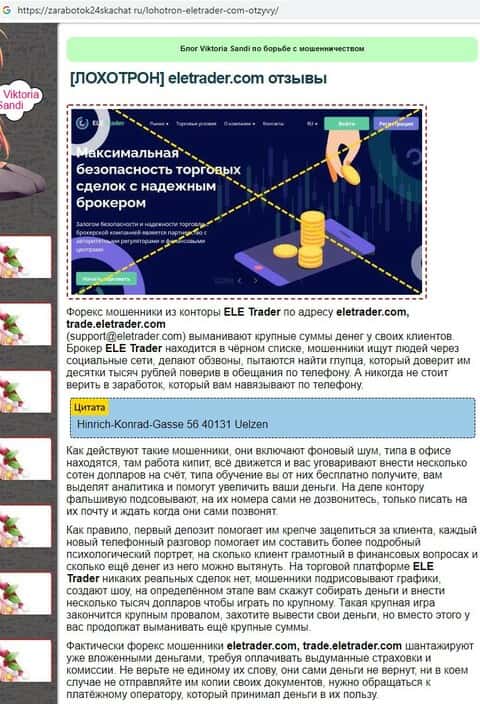 ELETrader - фиктивный биржевой брокер, который на постоянной основе промышляет невозвратом денежных вложений, сливом депозитов на крупные суммы и наглым обворовыванием интернет-пользователей, решивших зарабатывать деньги на Форекс. Поэтому нужно держаться подальше от подобных мошенников, как брокерская организация ЕЛЕ Трейдер!!!