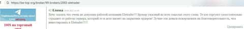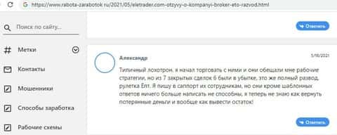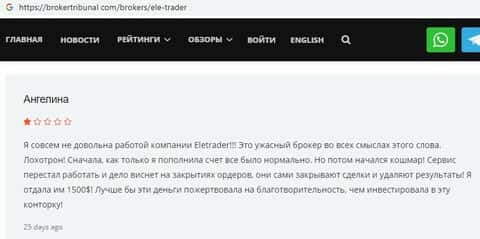 Далее можно прочесть отзыв кинутой на бабки клиентки, которая называет брокерскую компанию ELETrader обычным лохотроном, который внаглую обворовал ее на 1500 долларов.