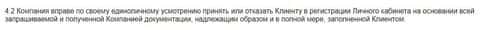 В пункте 4.2. соглашения упоминается, что ворюги ELETrader вправе отказать по собственному усмотрению клиентам в регистрации личного кабинета без каких-либо причин.