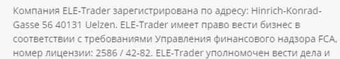 Согласно данным с веб-сайта ЕЛЕ Трейдер, то они осуществляют свою деятельность на основании лицензии №2586/4282 по требованиям Управления финансового надзора FCA.