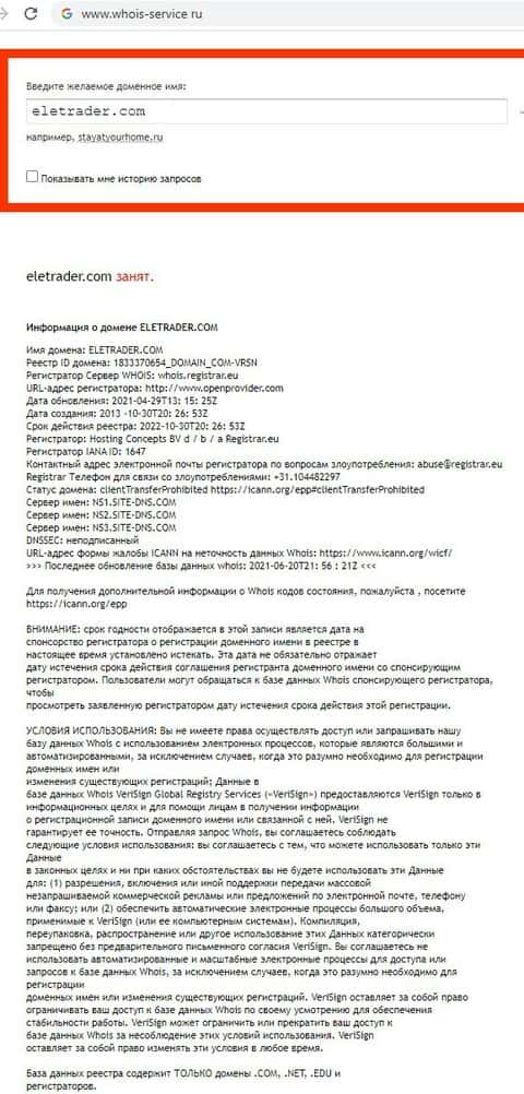 Кому принадлежит домен зашкварного брокерского проекта ELETrader?
