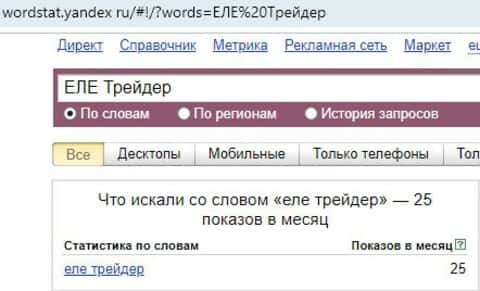 25 раз - такое количество интернет-пользователей пытались найти доменное имя "ЕЛЕ Трейдер" на русском языке с одним пробелом в поисковой системе Yandex.