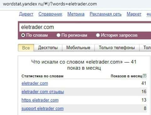 41 показ за месяц в поисковой системе Яндекс осуществляли по зашкварному центру на английском языке с точкой; осуществляли поиск по доменному имени "eletrader.com".
