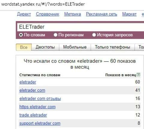 Количество запросов по домену "ELETrader", вбиваемого без единого пробела на английском языке, совершенных в поисковой системе Яндекс, достигло 60 показов в месяц.