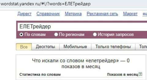 Брендовое имя "ЕЛЕТрейдер" на русском языке без пробелов в поисковике Яндекс предоставил следующий результат: нуль показов в месяц.