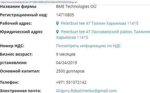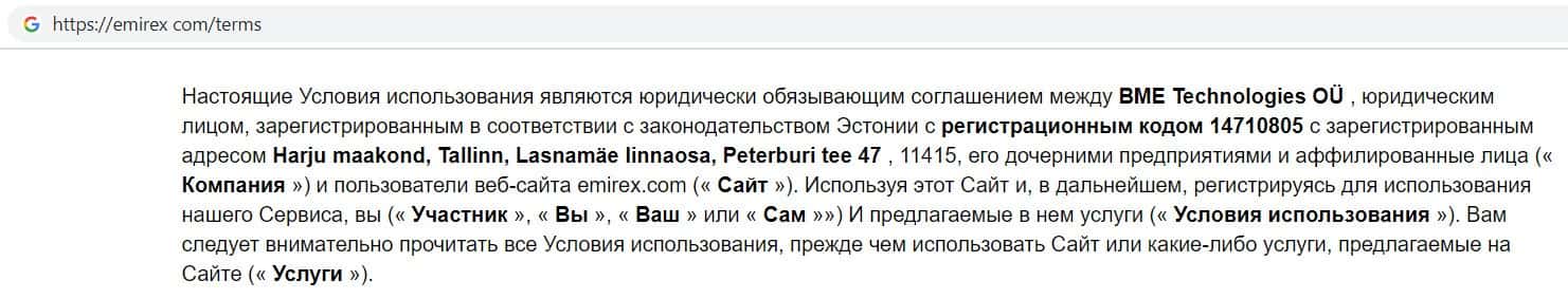 Контора финансовых кидал Emirex Com на своём главном сайте указала информацию о своём юридическом лице, которым в свою очередь является компания BME Technologies OÜ.