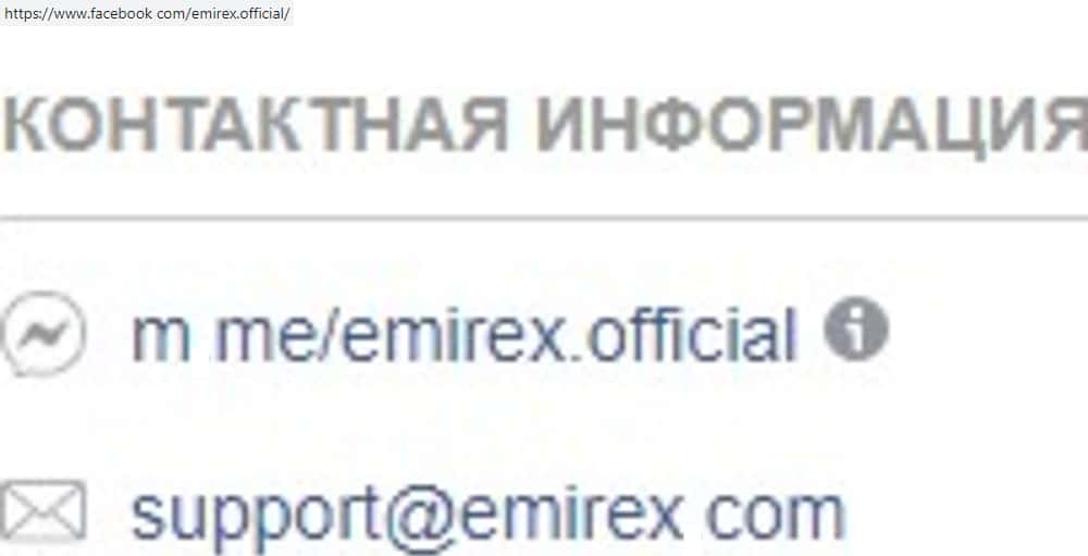 Контакты у скам-конторы Эмирекс довольно странно представлены, кроме чата на сайте. Первое что бросается в глаза, так это их отсутствие. Только изрядно потрудившись, удается кое-что разыскать. Что-то нашлось в соцсетях, а что-то только в реестре о получении псевдоразрешения на мошеннические манипуляции. Контакты жуликов Эмирекс: