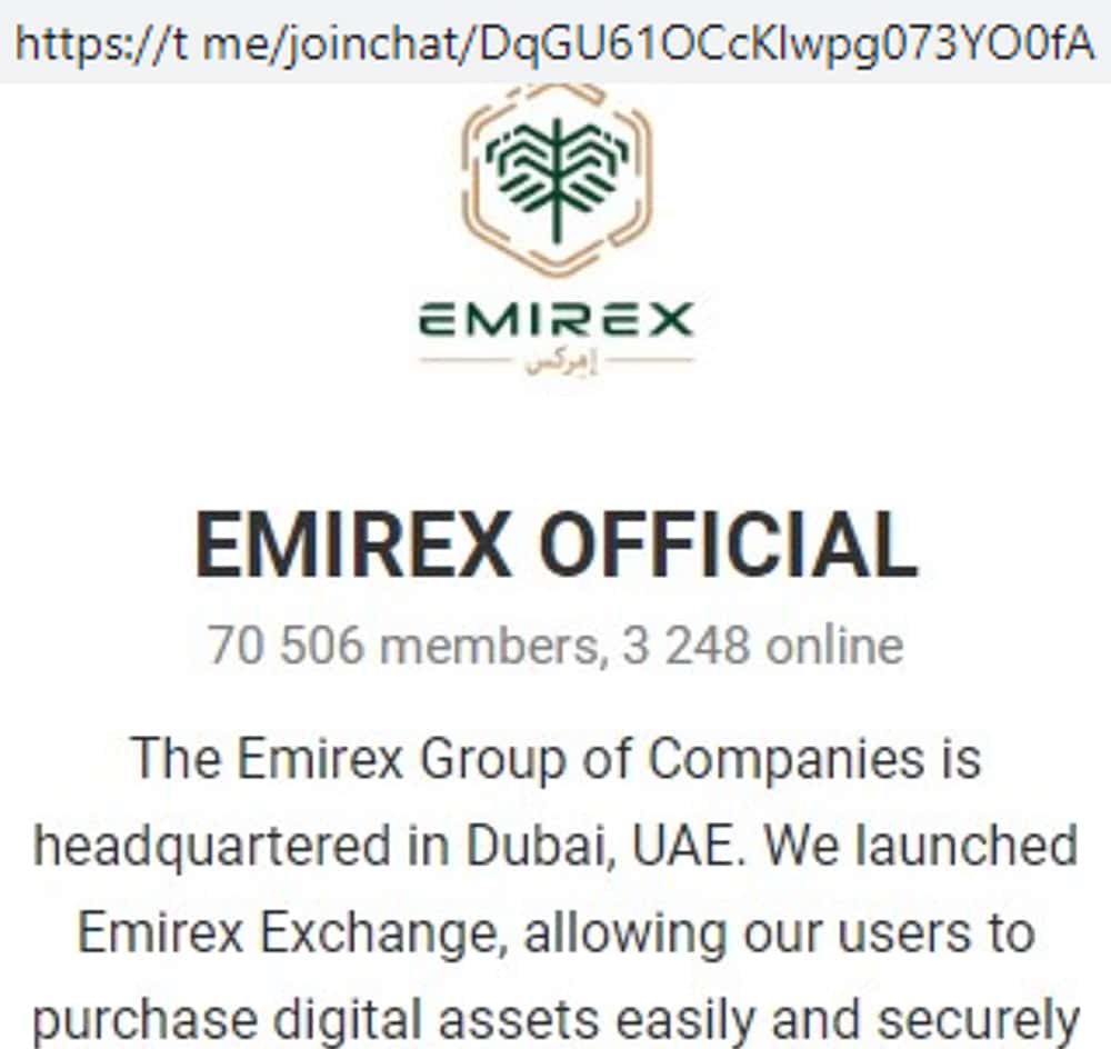 Еще способ связи, который предоставила авантюрная компания Эмирекс - это Телеграм. Анонимный способ связи, по которому естественно невозможно знать с кем вы ведете переписку. Даже в случае возникновения проблем, найти никого будет нельзя. Просто однажды абонент пропадет. Вместе с вашими деньгами.