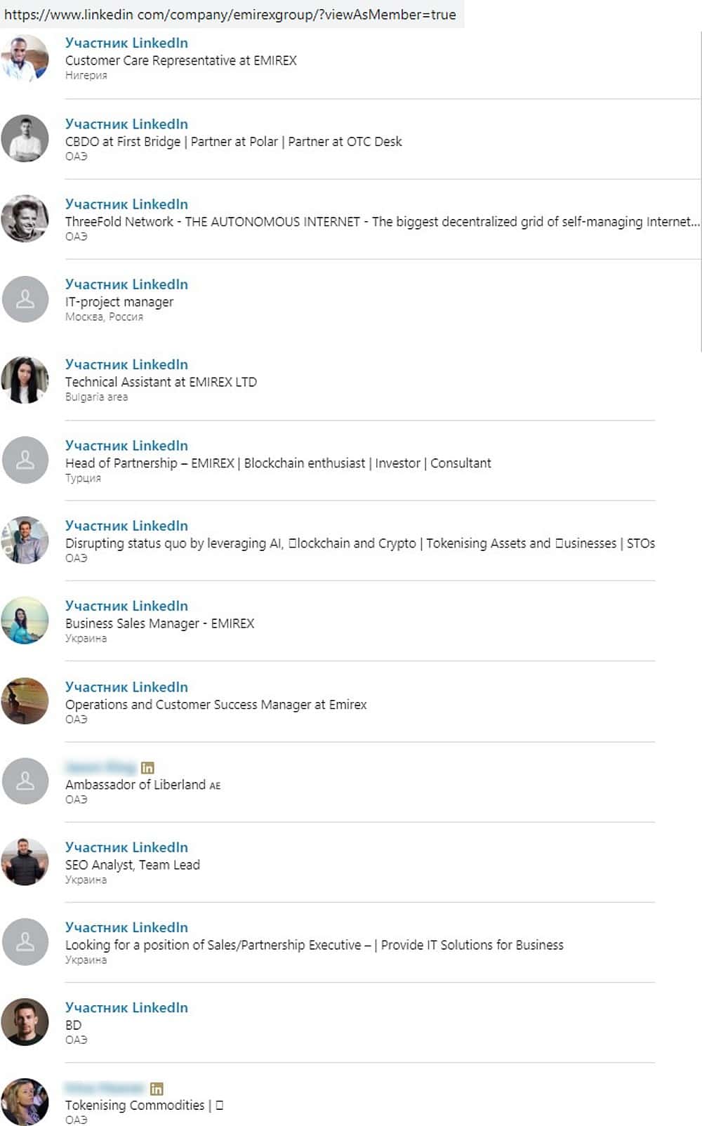 Конечно же позиционируя себя как серьезная организация, мутная контора Emirex Com разрослась и в социальной сети для поиска бизнес-партнеров linkedn com. Где если не здесь есть возможность найти себе жертв, которые могут позволить себе вложить большие деньги. Псевдофирма Emirex Com разводит по крупному!