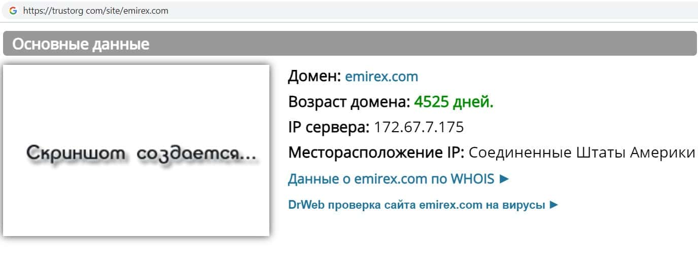 - Информация о возрасте главного сайта мошенников Эмирекс