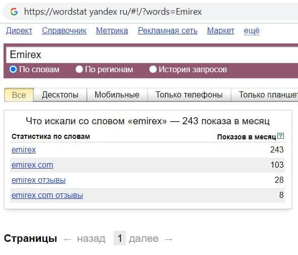 Мы проверили количество запросов компании мошенников Emirex Com в Яндексе по названию фирмы, а именно "Emirex". Данный запрос пользователи совершили 243 раза.