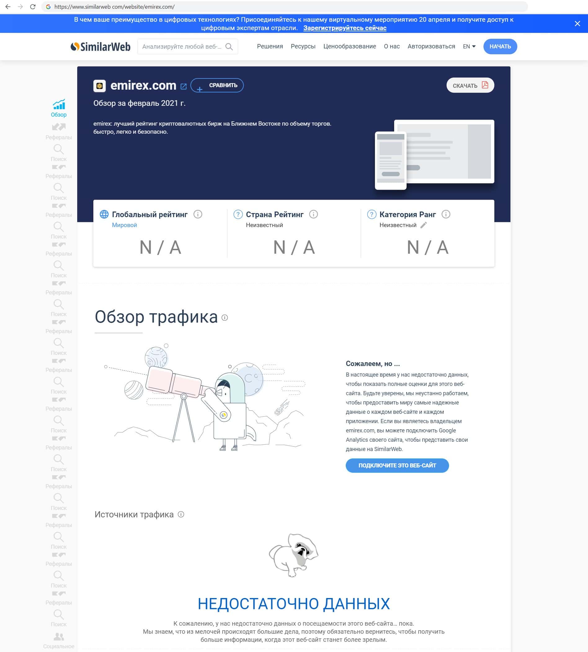 Чтобы узнать трафик сайта жуликов Эмирекс мы использовали сайт similarweb com. Оказалось, что международный сервис не обладает информацией о данных мошенниках.