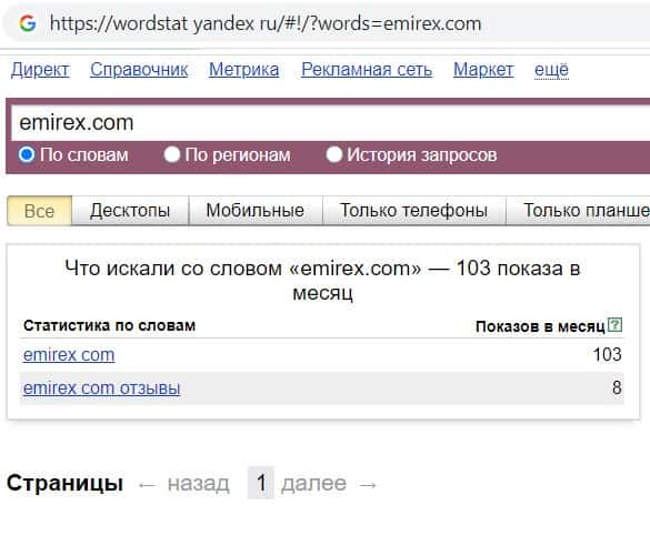 Так же мы решили проверить количество запросов недоконторы Emirex Com по русскоязычному названию компании, а именно "Эмирекс", но никто не выполнял этот запрос.