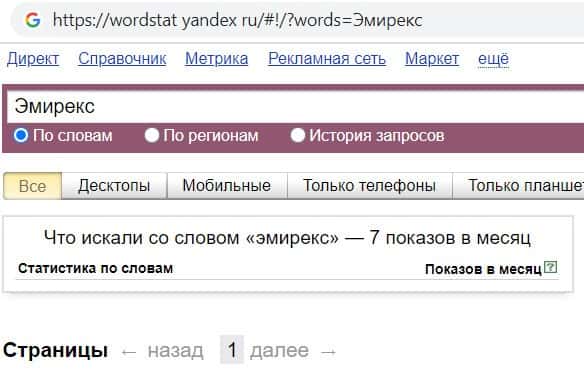 Далее мы проверили количество запросов компании Emirex Com по русскоязычному названию фирмы, а именно "Эмирекс". 7 раз пользователи выполнили этот запрос.