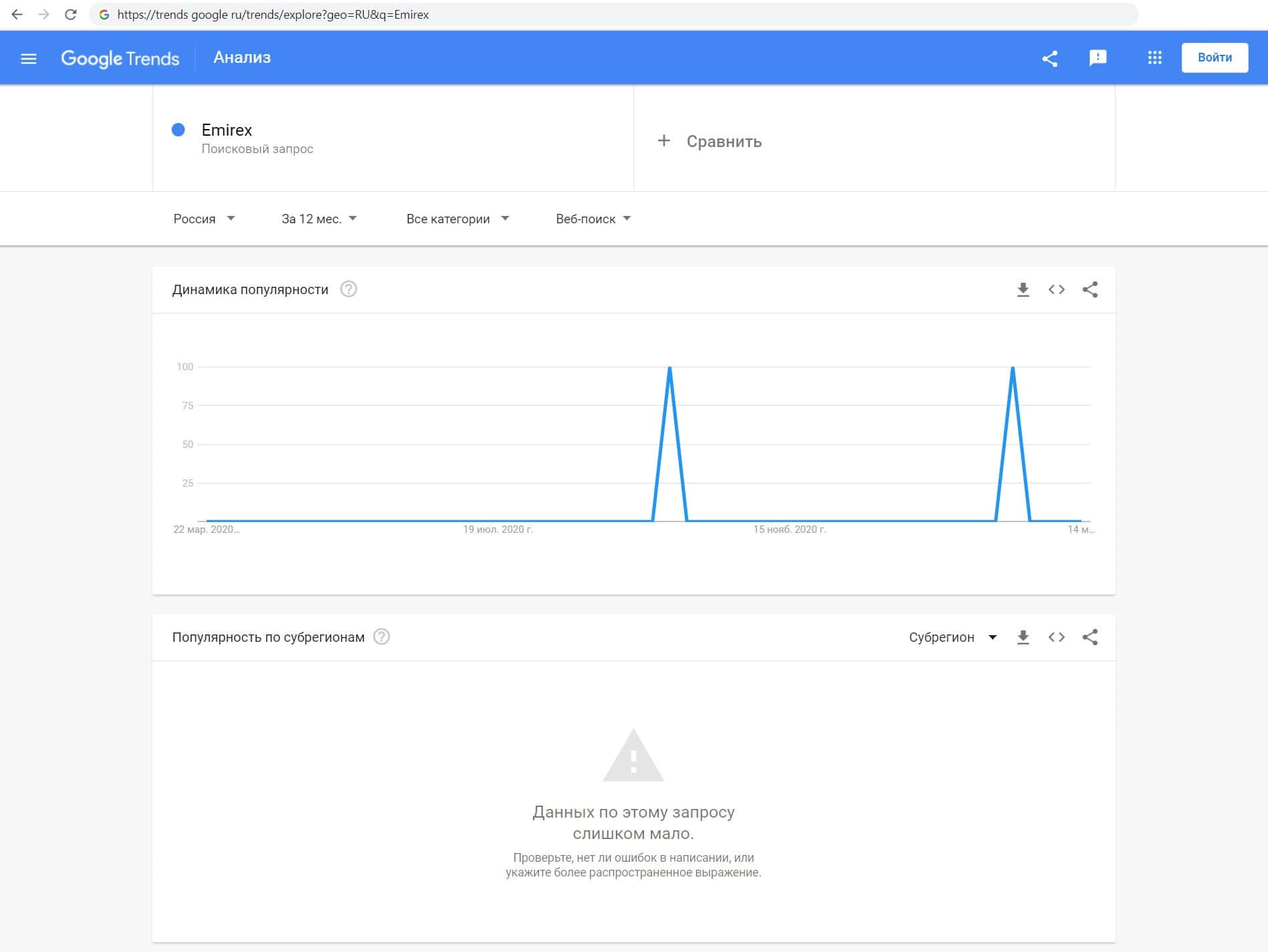 Мы решили проверить количество запросов компании Emirex Com в Google по названию фирмы, а именно "Emirex". За целый год пользователи выполнили запрос не более 100 раз.