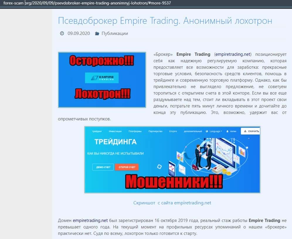Очередная статья о мошенническом брокере Эмпайр Трейдинг была найдена в сети интернет. Мошенники каждый раз делают новые сайты и эта шарага вполне не исключение.