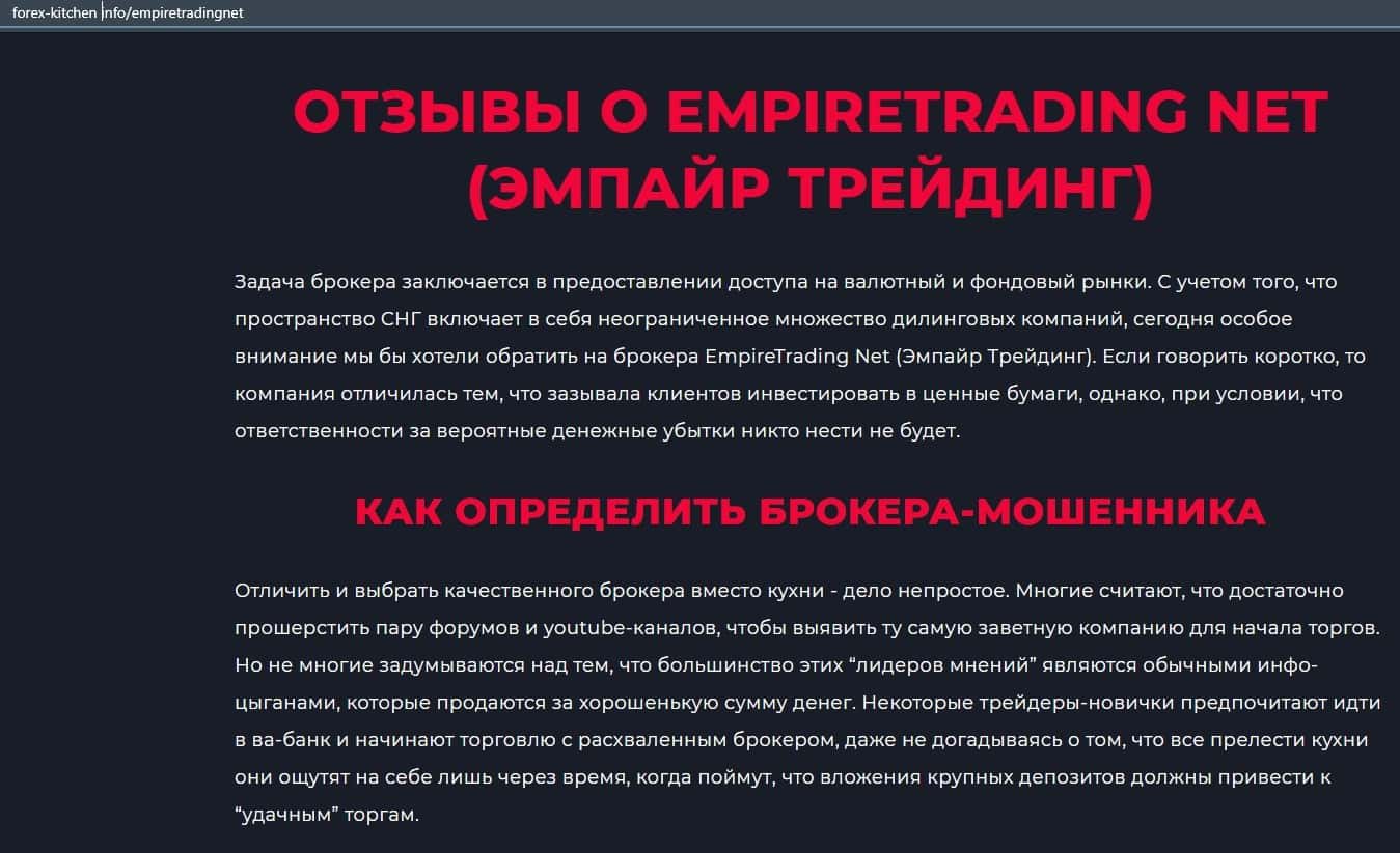 Еще в одной статье описывается, что шулерская кухня EmpireTrading Net не предоставляет никаких брокерских услуг, а попросту выманивает деньги из кармана наивной клиентуры.
