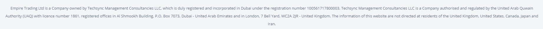 Касательно конкретного юридического лица, которому принадлежит форекс-лохотрон Эмпайр Трейдинг, это компания Techsync Management Consultancies LLC из ОАЕ.