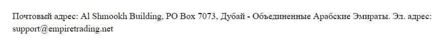 Далее представлена контактная информация касательно мошеннической конторы Эмпайр Трейдинг и здесь мы можем видеть адреса конторы и электронную почту. Вот все данные: