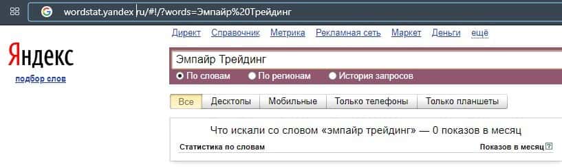 По версии Яндекс Вордстат мошенники с брендом "Эмпайр Трейдинг" не набрали запросов очень в Яндексе вообще, поэтому и появляется нулевая цифра показов.