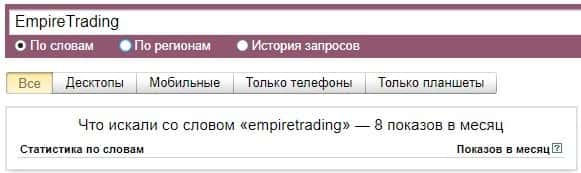 Мы также пробили сайт без точки в домене "EmpireTrading" и система Яндекс Вордстат выдала 8 запрос за последний месяц, что показывает их слабую популярность.
