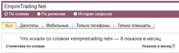 Та же ситуация и с обычным сайтом "EmpireTrading.Net", данные о котором в запросах Яндекс Вордстат был обнаружен и набрал 8 показ в месяц.