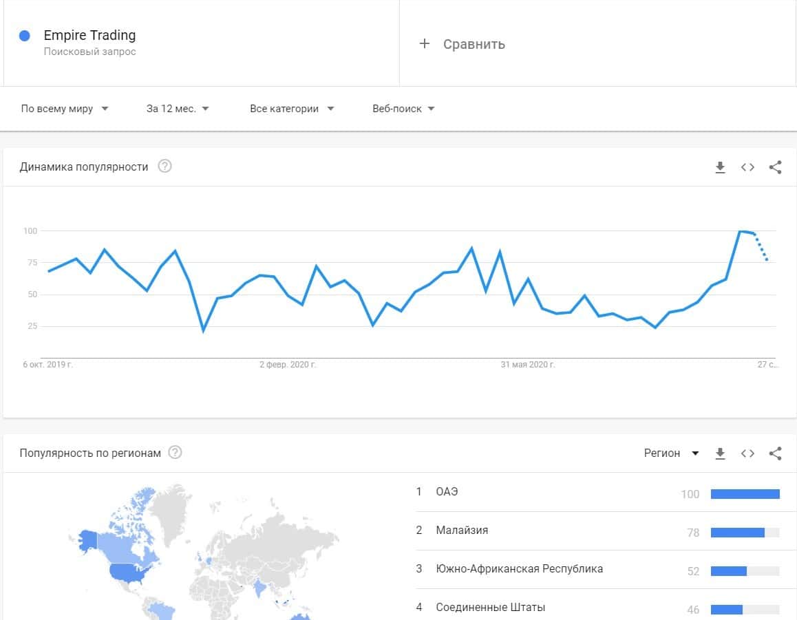 Ну и совсем другие показатели, если ввести бренд лохотрона "Empire Trading" с пробелом. Мошенники по такому запросу популярны в ОАЭ, Малайзии, ЮАР и Соединенных Штатах.