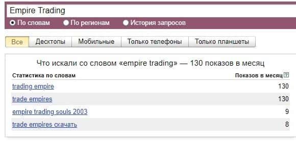 Информация о запросе бренда "Empire Trading" на сайте Яндекс Вордстат довольно распространенная, и набрала 130 показов за месяц.