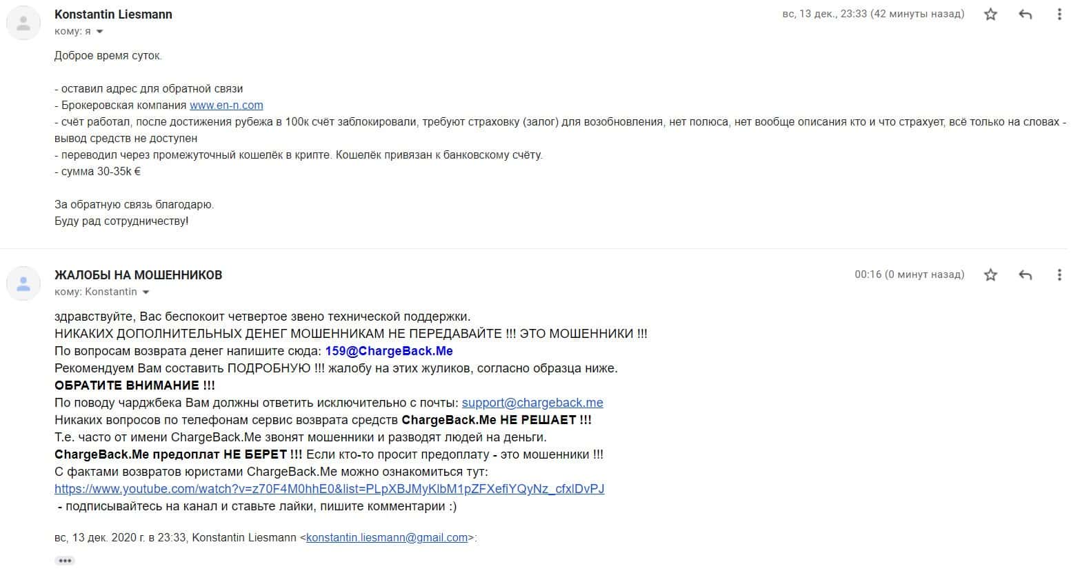 Ещё контора кидал EN N указала адрес электронной почты, куда пользователи должны писать свои вопросы. Но компания будет просто игнорировать письма. Почта аферистов:
