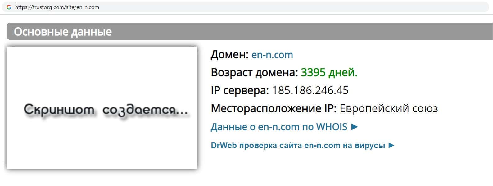 Через сайт "Доверие в Сети" мы узнали, что фирма EN N существует уже более 9 лет. Но то, что за это о компании в сети практически нет информации является очень подозрительно.