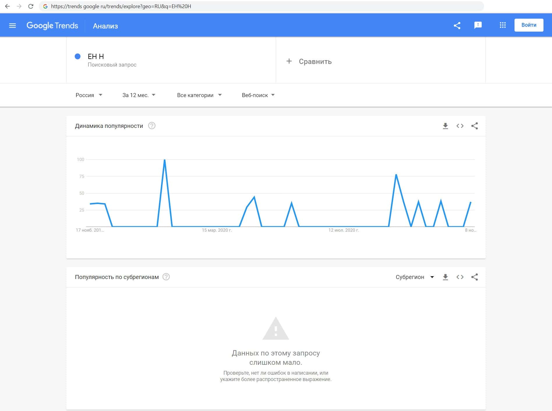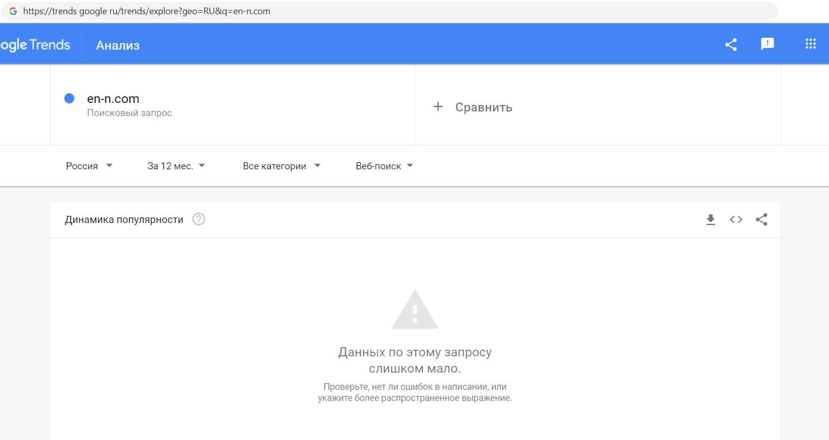 Мы решили проверить количество запросов фирмы EN N в Google по названию компании, а именно "EN N". В данный момент пользователи стали выполнять этот запрос всё чаще и чаще.