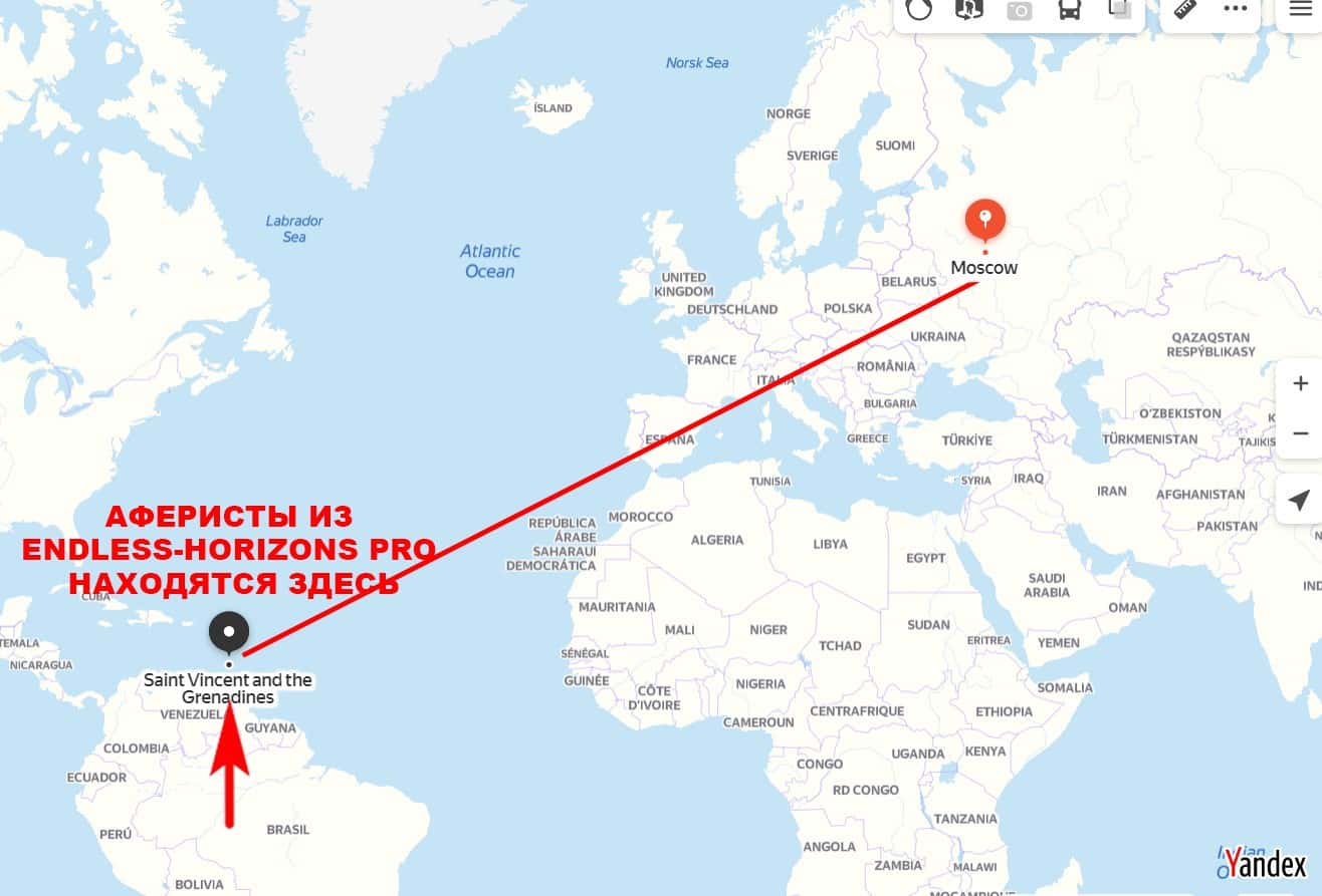 Ворюги, создавшие форекс дилинговую контору Endless-Horizons Pro, находятся в Сент-Винсент и Гренадинах, что прекрасно помогает им действовать незаконно, пополняя свои запасы средствами трейдеров. Изображение карты ниже.