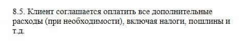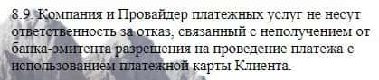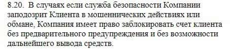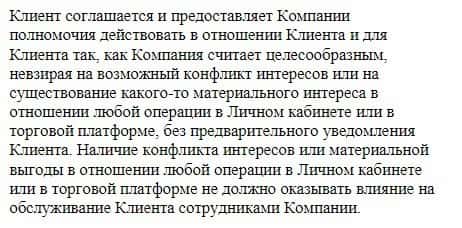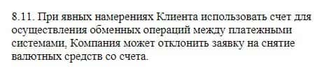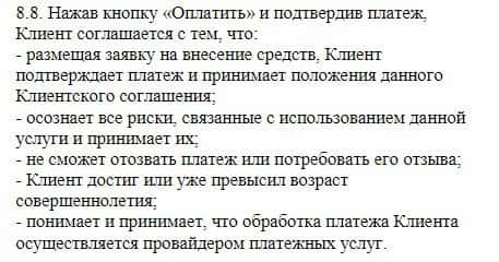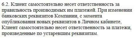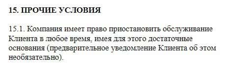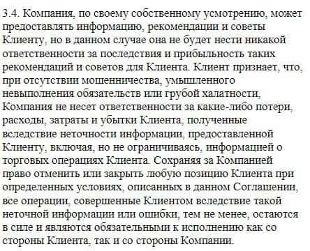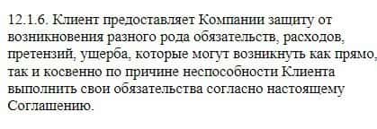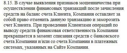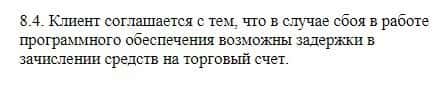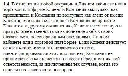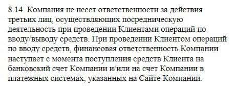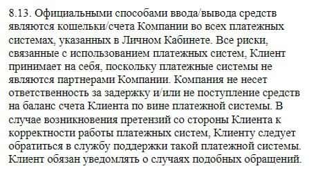 Согласно следующему пункту договора все риски, связанные с использованием платежных систем ложатся на плечи клиента, а брокер не отвечает за непоступление средств на счета трейдеров.