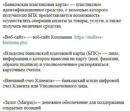 Раздел 2 посвящен терминам и определениям, которые попадаются в договоре, в общем, мошенники Endless-Horizons пытаются пустить пыль в глаза новичкам своим якобы профессионализмом.