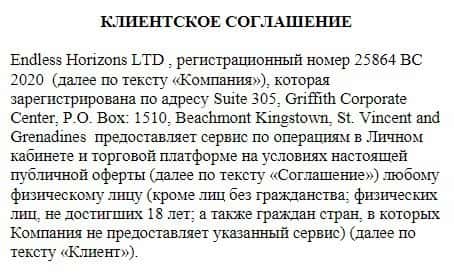 Клиентское соглашение шулерской брокерской организации Endless-Horizons Pro