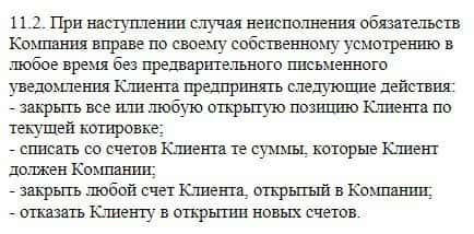 В пункте 11.2. идет речь о том, что в следующих случаях лживый брокер Эндлесс Горизонс может по собственному усмотрению закрыть любой счет, отказать в открытии счета. Но это все нарушение закона.
