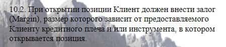 В пункте 10.2. договора идет речь о том, что клиент обязан внести залог при начале торговле с мошенниками Эндлесс Горизонс, чтобы обезопасить прежде всего лжеброкера.