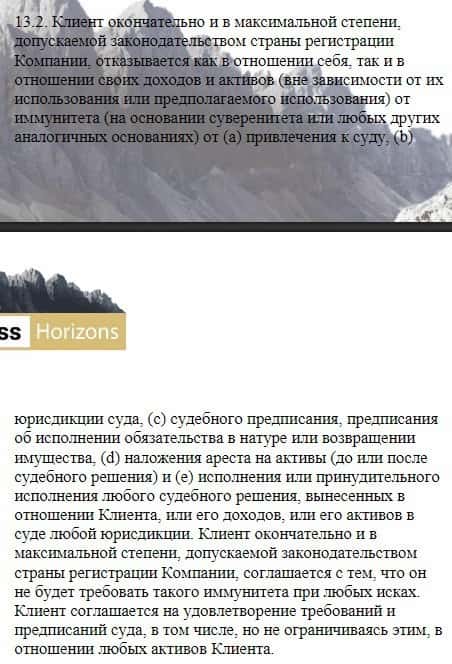 Пункт 13.2 договора с Endless-Horizons гласит, что трейдер отказывается от предоставляемого по законодательству иммунитета, но это незаконное принуждение к отказу от гарантий своих прав.