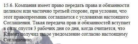 Пункт 15.6. соглашения - верх цинизма и нарушения всех норм действующего законодательства, передавая права и обязанности третьим неизвестным лицам, наплевав на интересы клиентов.