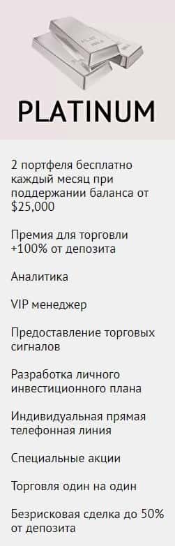 "Platinum" торговый счет предполагает вклад пользователя в размере 25000 долларов. Ему предоставляют ко всему прочему целый список преимуществ, чтобы вкладчики расщедрились и потеряли бдительность.