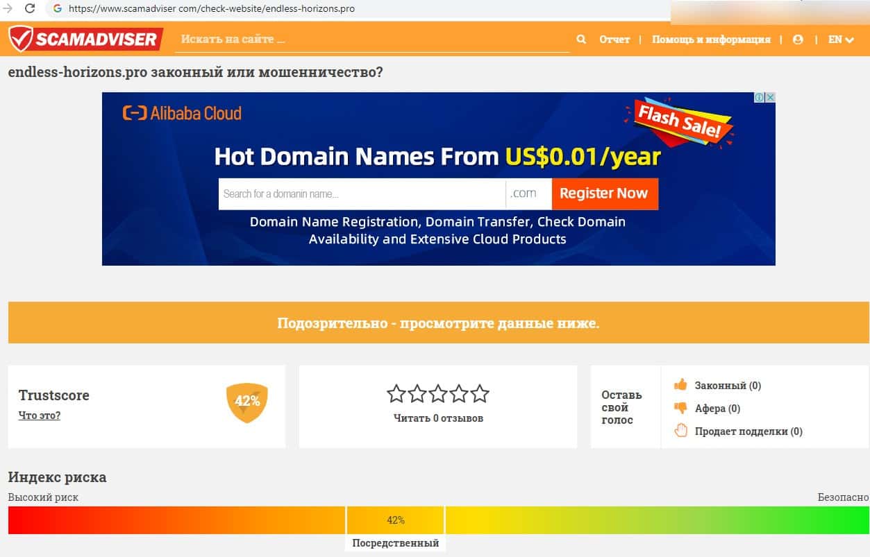 Подставная контора Endless-Horizons Pro по мнению уважаемого интернет-ресурса scamadviser com имеет посредственный индекс риска 42 %, что вызывает крайне сильные опасения.