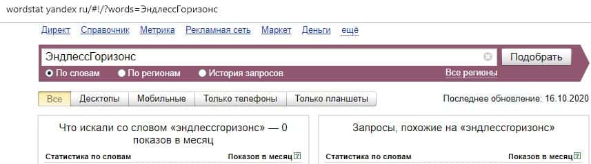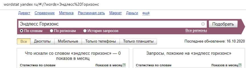 К сожалению, количество запросов по домену "Эндлесс Горизонс", вбиваемого с пробелом на русском языке, совершенных в поисковой системе Яндекс, равняется нулю показам за месяц.