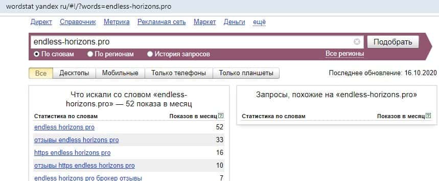 52 показа в месяц в поисковике Яндекс осуществляли по фиктивной форекс компании Эндлесс Горизонс на английском языке с точкой, а именно - делали поиск имени "endless-horizons.pro".