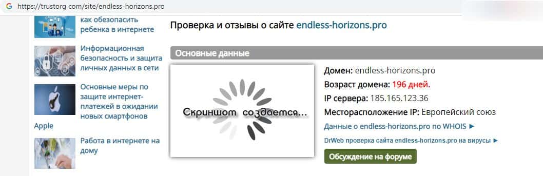 Согласно данных с популярного веб-сайта trustorg com, возраст домена плутовского брокера Endless-Horizons Pro составляет 196 дней с расположением в Европейском союзе. Не нужно доверять басням такого непроверенного проекта.