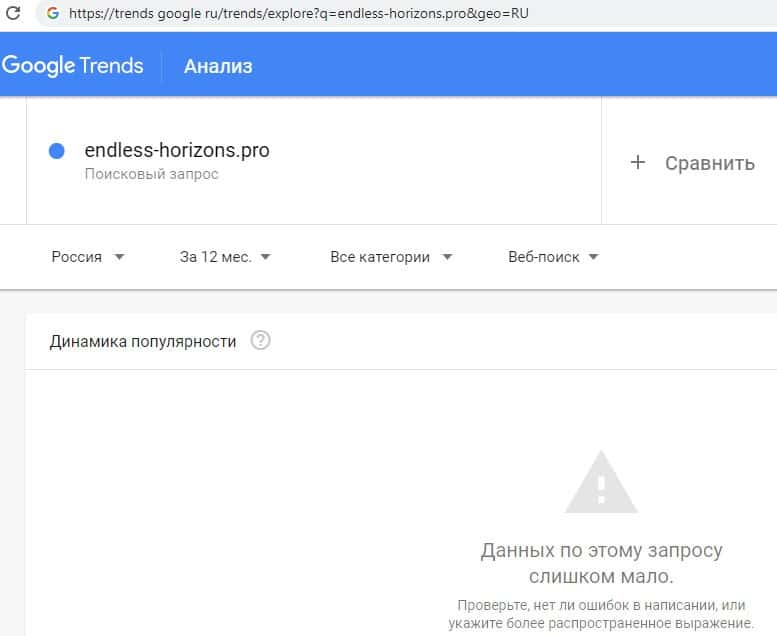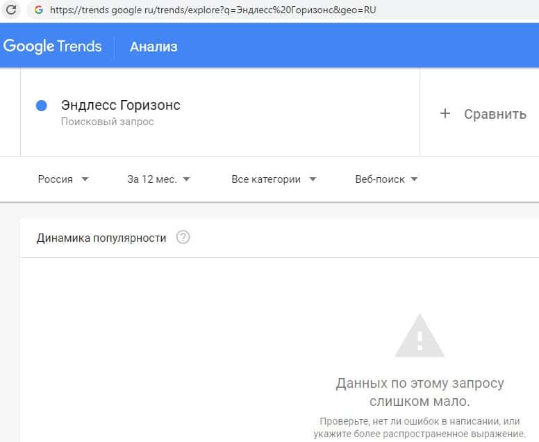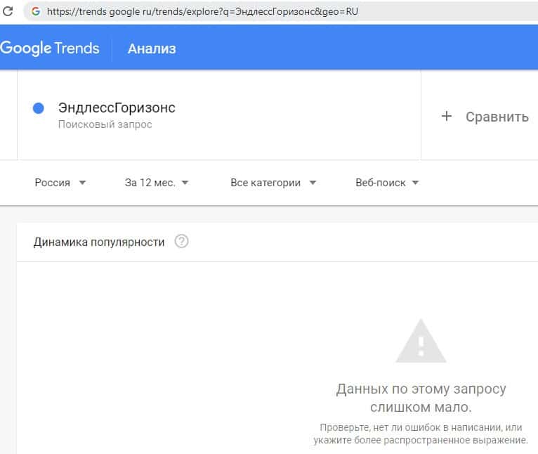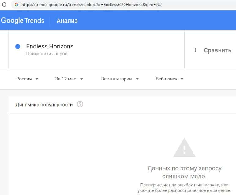 Далее посмотрим, какие же результаты поиска покажет проверка брендового имени "Эндлесс Горизонс", написанного с пробелом на русском языке. Ответ такой же, слишком мало запросов.