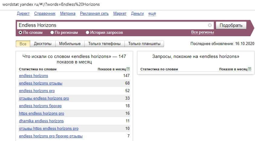 Англоязычный вариант доменного имени "Endless Horizons", вбиваемого на английском языке в поисковом сервисе Яндекс.Вордстат, набрал 147 значений по запросам за месяц.