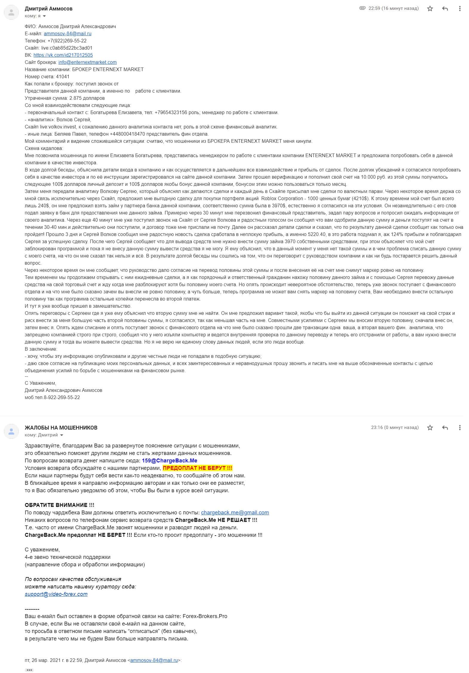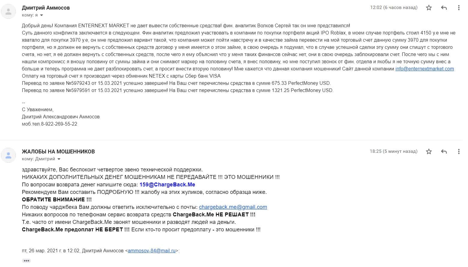 Далее предоставлена первоочередная жалоба от пострадавшего от мошеннической деятельности псевдо-брокерской конторы EnterNextMarket.