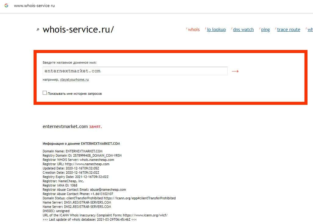 - Информация о возрасте домена скам-организации EnterNextMarket