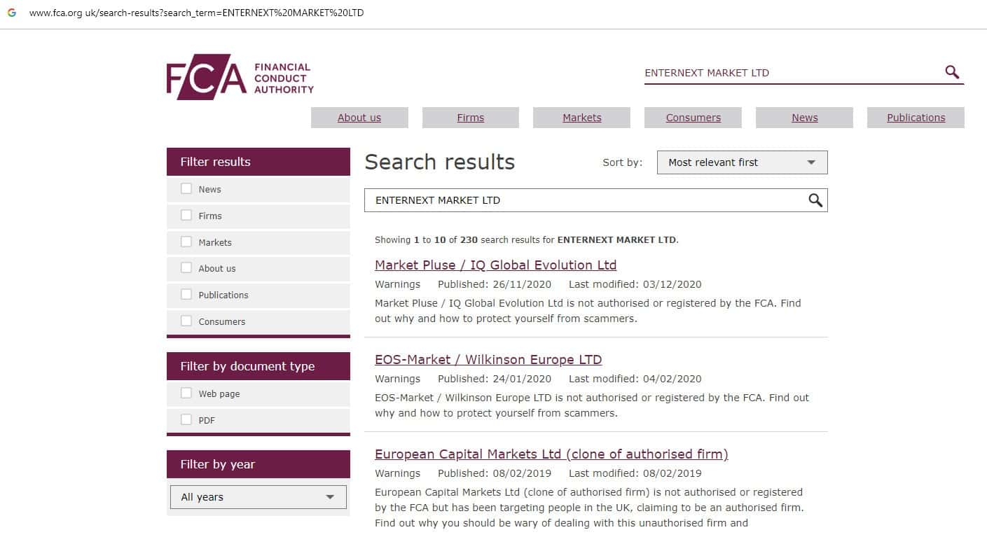 На официальном сайте финансового регулятора Великобритании fca org uk нет никакой информации о такой компании как EnterNextMarket, что является признаком липовой конторы.