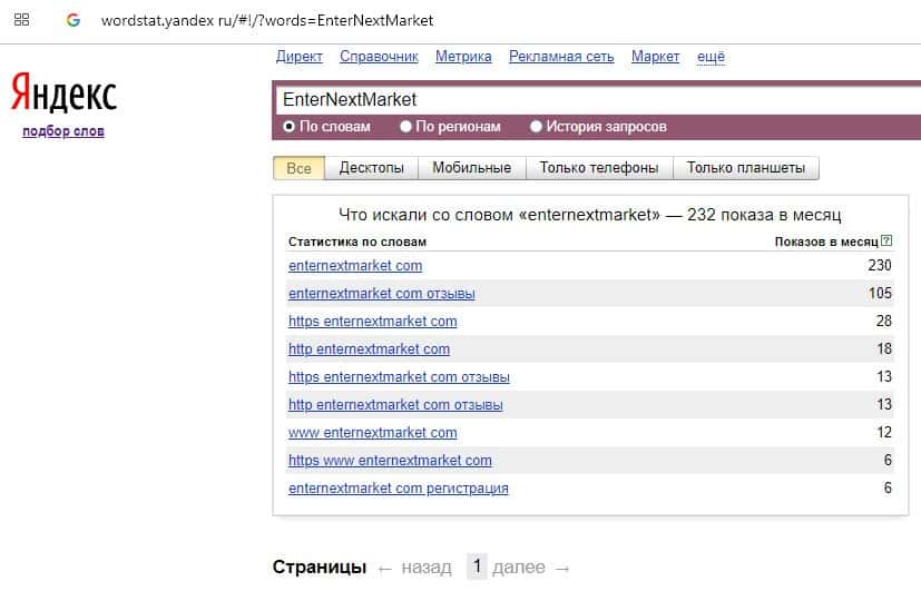 Количество брендовых запросов названия компании на английском языке "EnterNextMarket" на wordstat yandex ru составило 232 запроса за месяц.